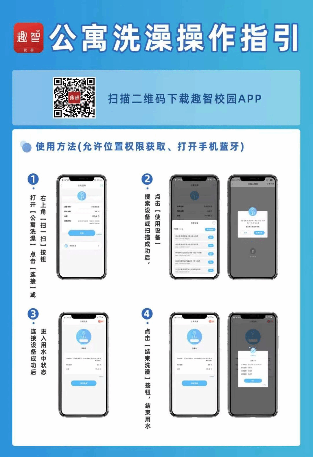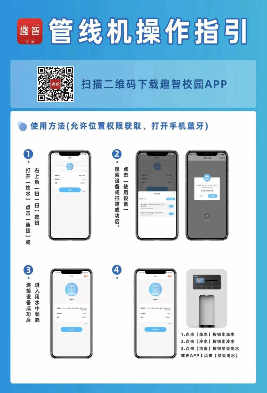 学生宿舍楼内提供直饮水,办理CPU水卡刷卡取水,直饮机面板旋转按钮可切换冷热水。直饮水收费标准:冷水0.25/500ml;热水0.5/500ml。直饮水办卡及充值点位于A校区医务室旁边。学校宿舍浴室提供热水,热水使用说明如下: